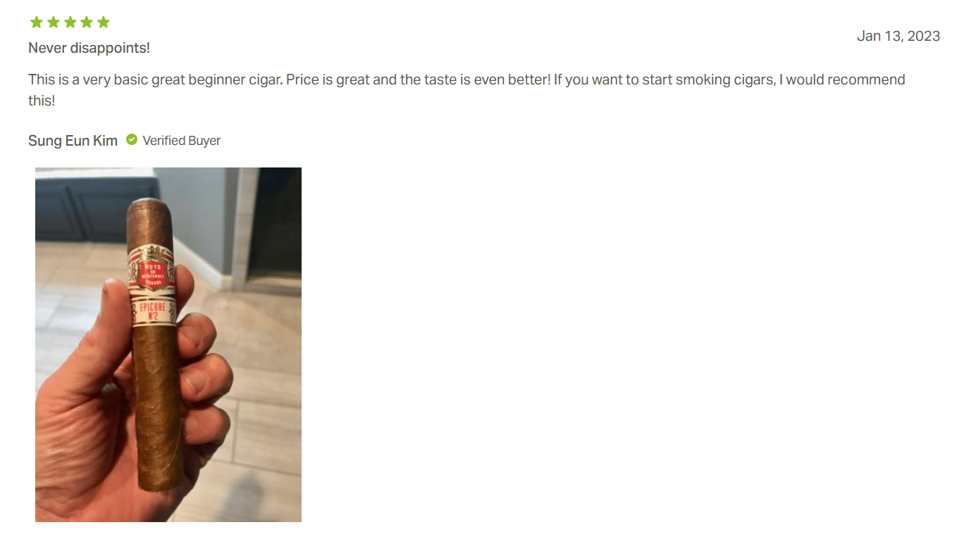 - User Reviews: Our customers report that the Epicure No 2 is rich in flavor. It’s also said to deliver a smooth smoking experience. One reviewer even specifically hails the Epicure No 2 as a “great beginner cigar”.
