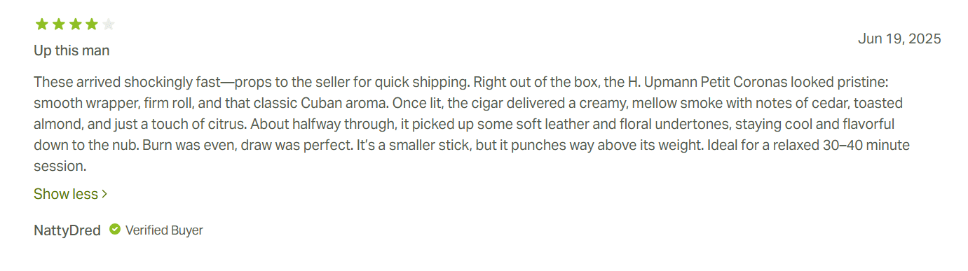 - User Reviews: It’s amazing how much flavor can be squeezed into such a small stogie. That’s a sentiment shared by multiple reviewers. Some also comment on the “perfect” draw.