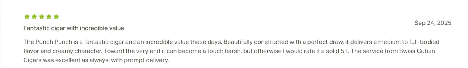 - User Reviews: Our customers have reported back about the Punch Punch’s delightful creaminess. Judging from reviews, this cigar has also been expertly assembled. This doubtless helps to explain its smooth, even burn.