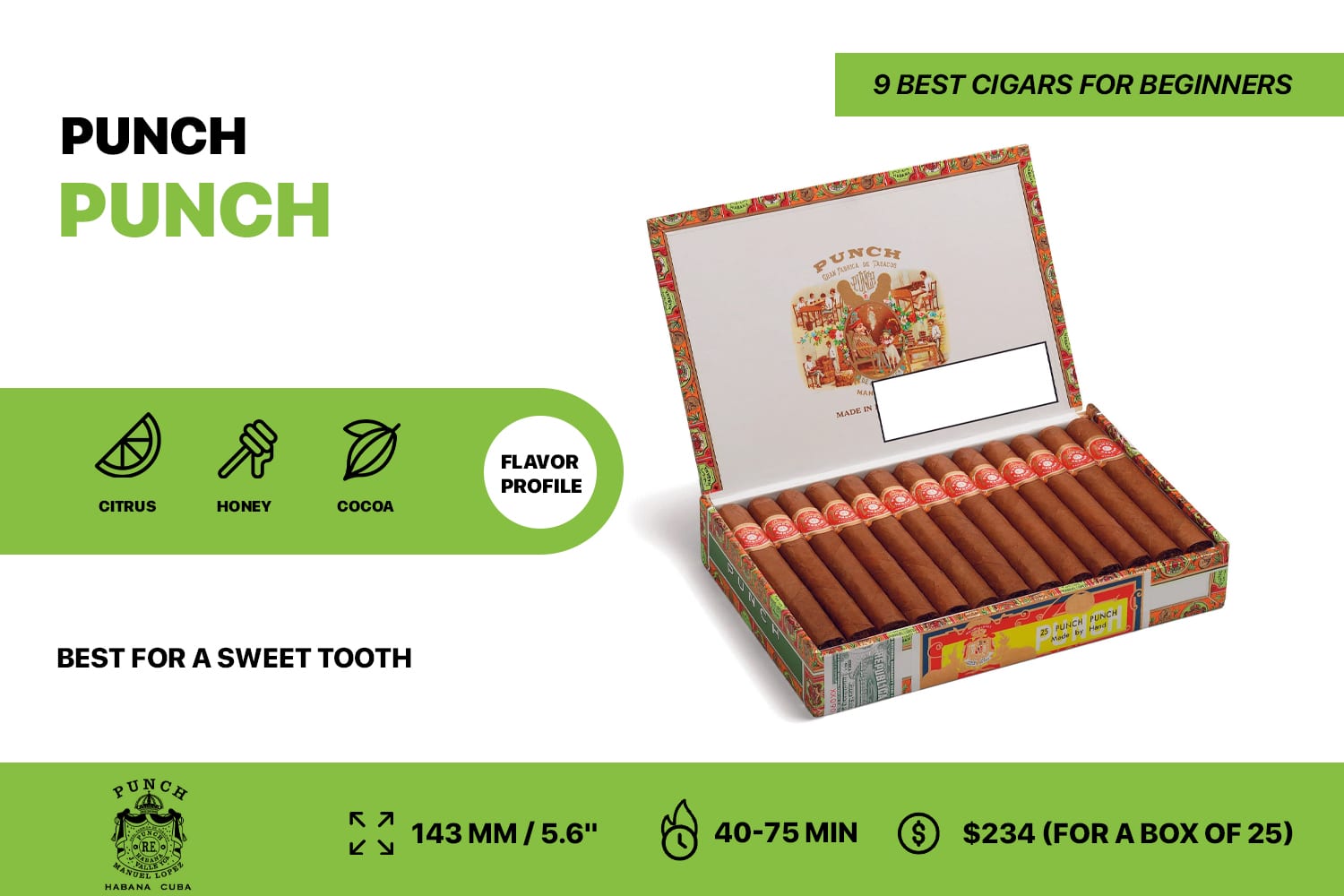 - Why it’s a great fit for beginners: This is one of the stronger-bodied cigars for beginners. However, its cornucopia of familiar flavors means it’s well worth checking out. Here at Swiss Cuban Cigars, we stock Punch Punch samples in packs of 3.