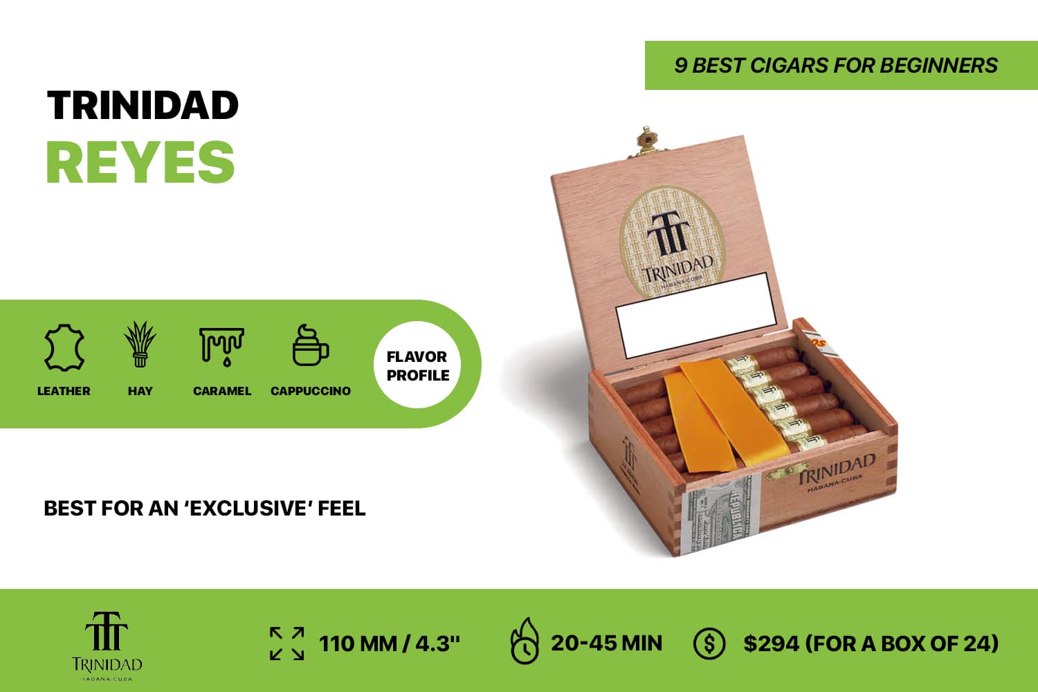The earliest Trinidad stogies were all 7.5-inch long with a 40 ring gauge. This classic cigar survives today as the Trinidad Fundadores. However, Trinidads are now available in many different vitolas. The Reyes is one of the most appealing Trinidad cigars for beginners.