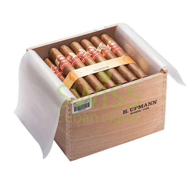 H. Upmann is a pre-revolutionary Cuban cigar brand that was founded by a German immigrant. H. Upmann Magnum 50 cigars have an elegant deep brown color and a silky touch. They are hand-made from the premium Vuelta Abajo tobacco. They have a classic Double Robusto shape, a large length and a gauge size of 50. The strength of the cigar is medium to full and the aromas present are wood, sweetness and spice. These delights come in a marvelous wooden cabinet of 50.