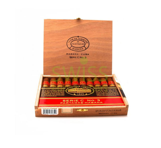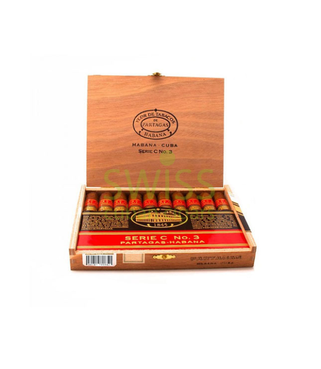 Partagas Serie C No.3 cigars come in a marvelous wooden box of 10 that shows the brand legacy and pride. The cigars have a Grand Corona shape, a medium length and a gauge size of 48. The wrapper has a deep chocolate brown color and a smooth touch. The construction and the draw are impeccable, showing the premium hand-made work of the Partagas factory. The tobacco used comes from the famous Vuelta Abajo region and the strength of the cigar is full. The notes present are earth, leather, wood and dried fruit that mix in a perfect balance of aroma.
